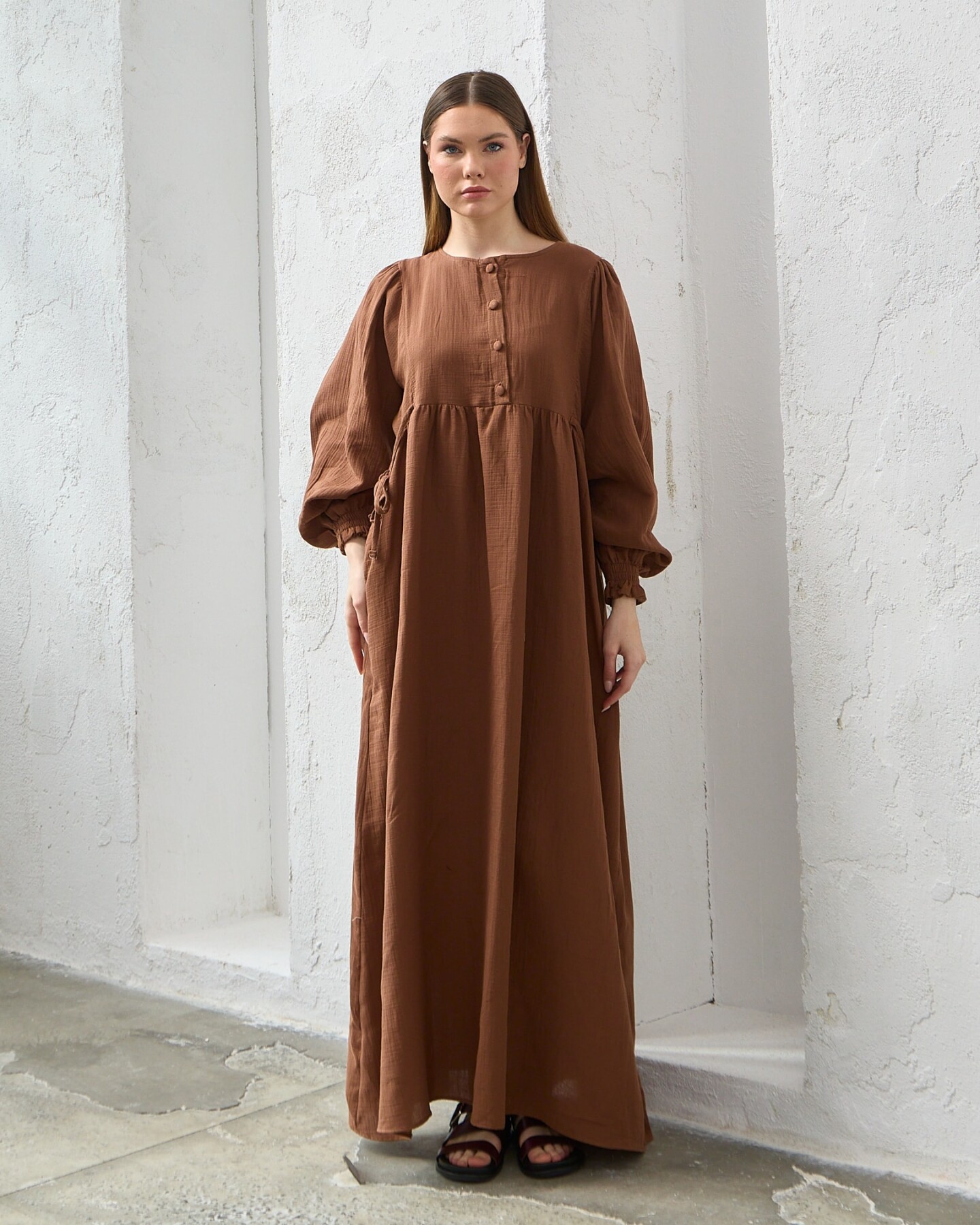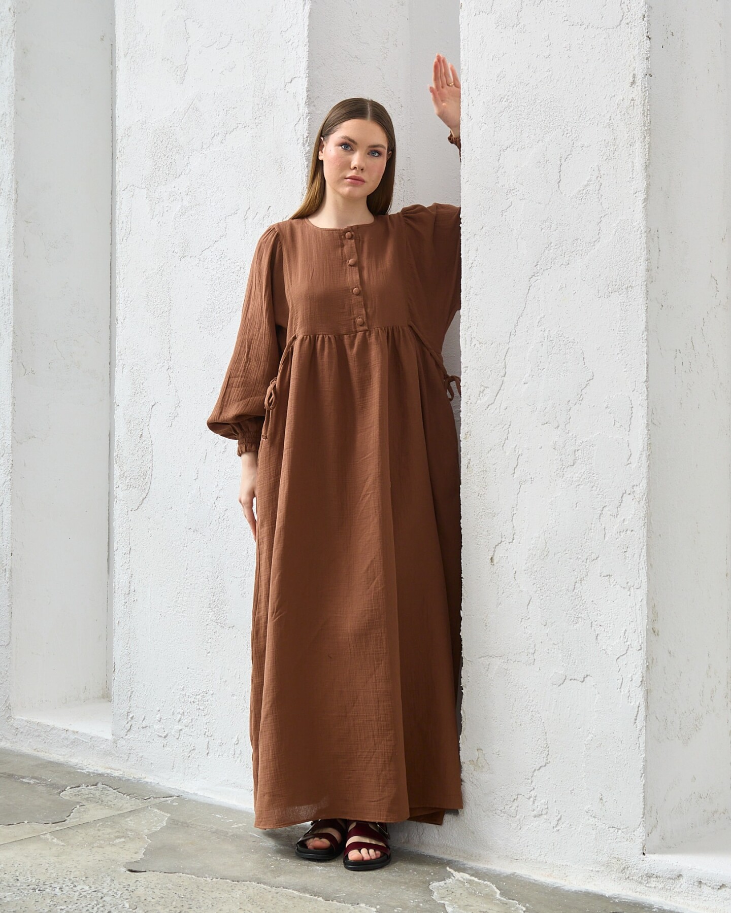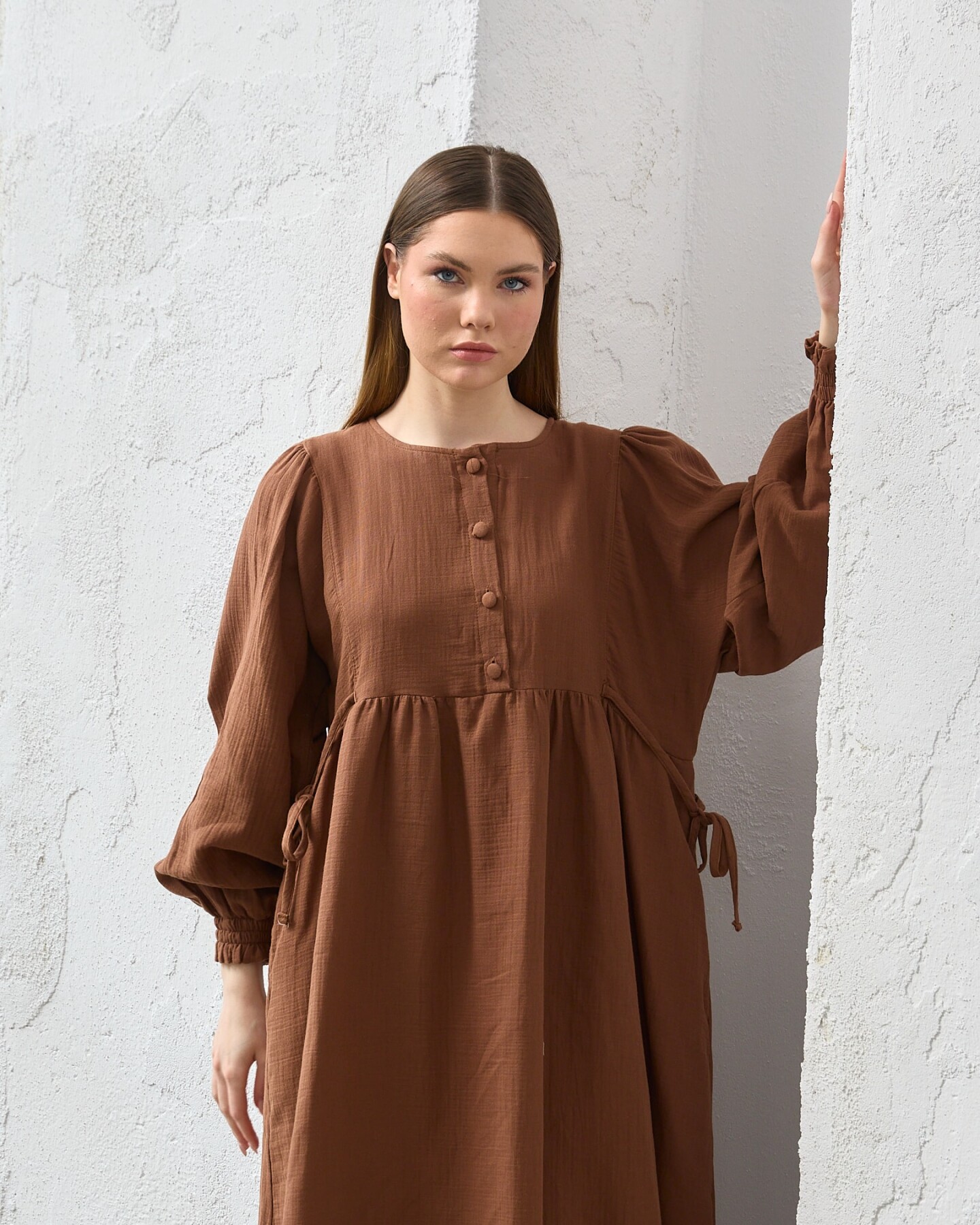 0078 Müslin Belden Bağlamalı Elbise Kahverengi