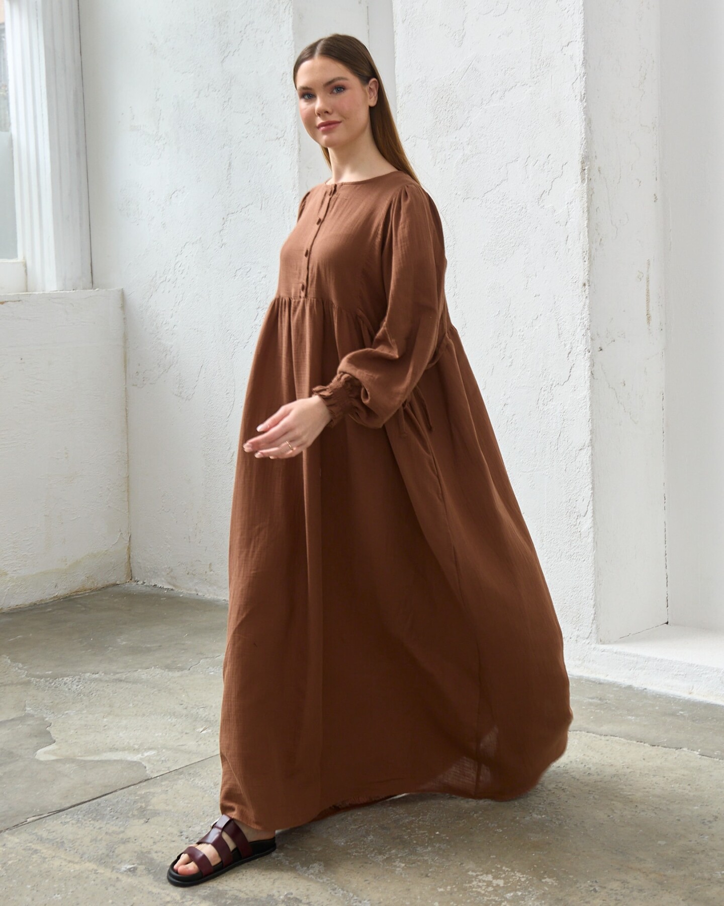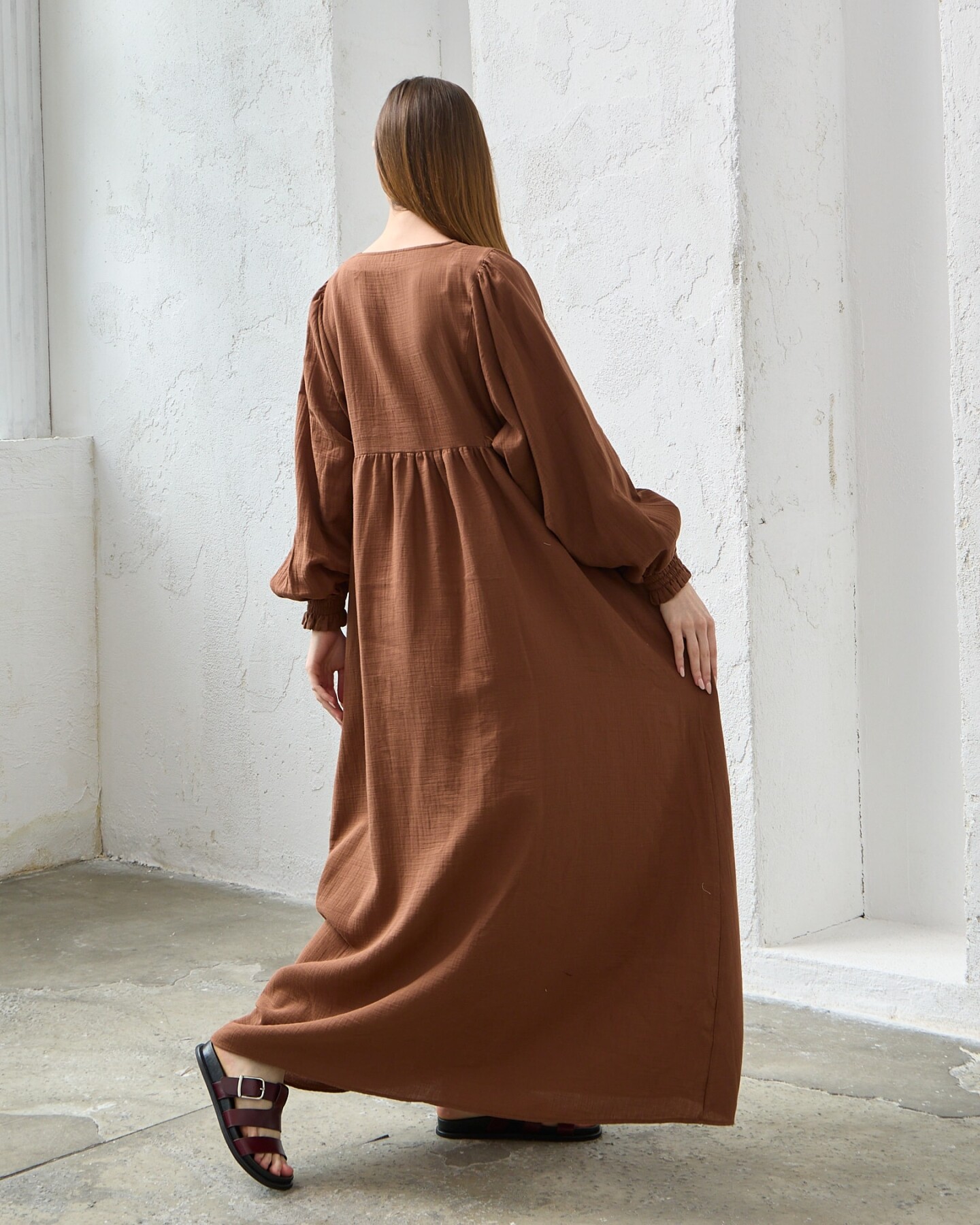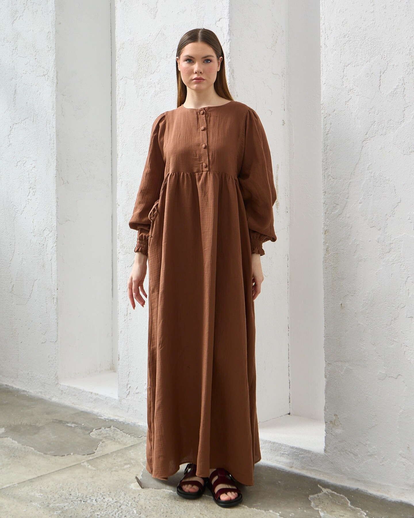 0078 Müslin Belden Bağlamalı Elbise Kahverengi